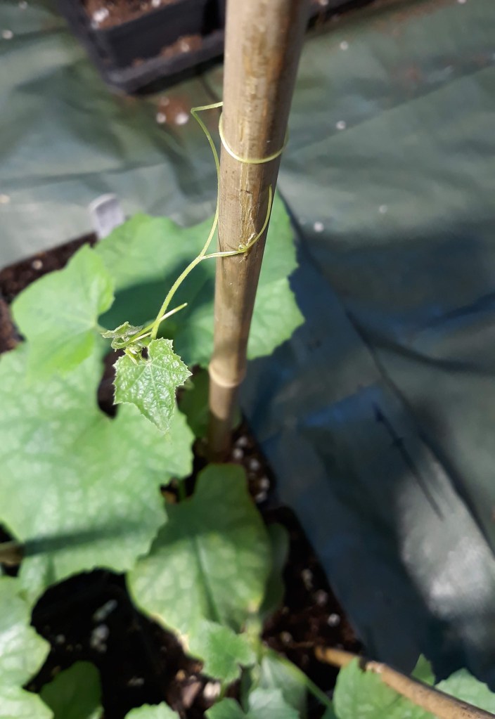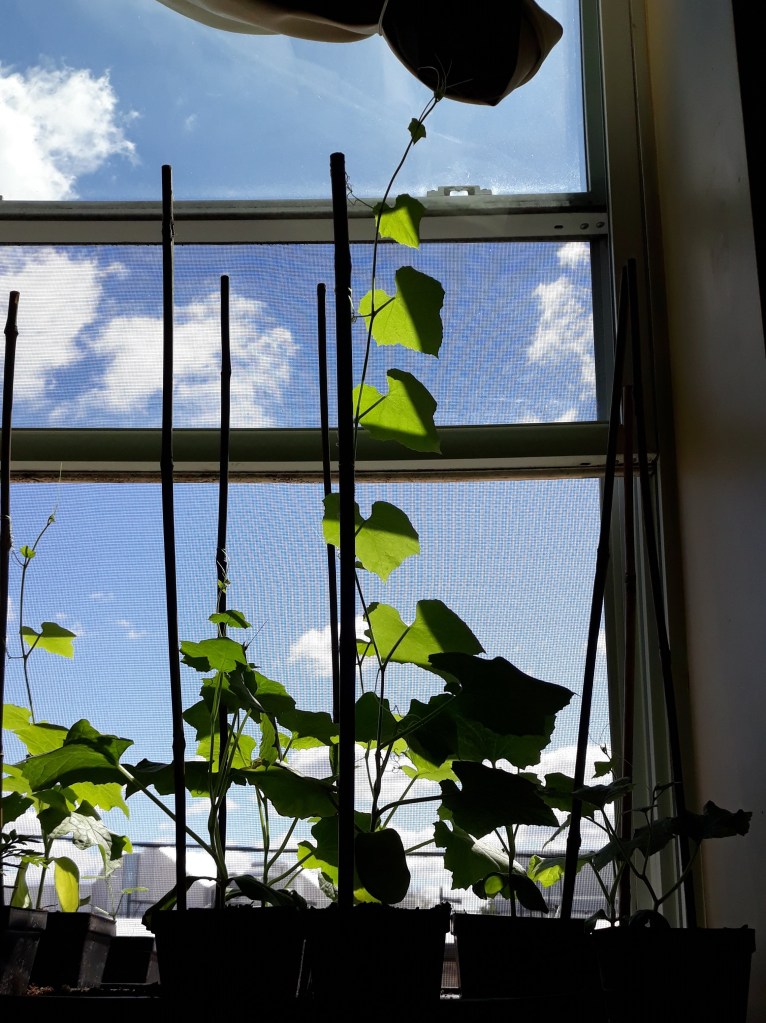 {5/3/21} ••• LOOFAH UPDATE #8: Happy May, plant friends! Been so busy lately that I haven’t had a chance to update on all the wonderful loofah happenings. And oh, it’s happening! As of today, I have 22 healthy loofah plants! Six plants already have tendrils reaching and wrapping around 2′ bamboo stakes placed in each individual pot. The seeds I saved from last year germinated very nicely and I’m happy to have grown “extra” in case I loose any in the transplanting process. At least 10 plants will be dropped off to those in the surrounding area, and I’m really excited about that!