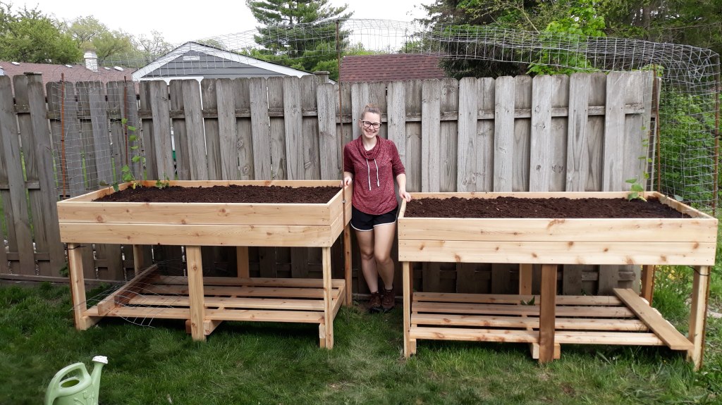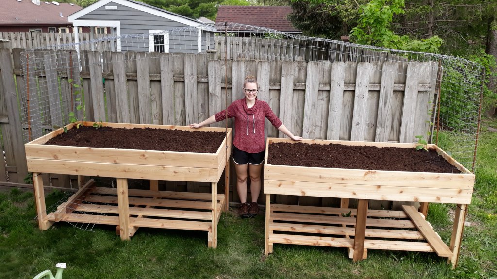 {5/24/21} ••• LOOFAH UPDATE #10: Wow! Time is flying, though we’ve only just begun the outdoor season! I think it’s a great day for a loofah update. Since hardening off in my apartment window, I’ve transferred a few of my loofah starts first to the back porch for a few days, then into my new raised beds! This garden design was an idea I created in a notebook earlier this year, and with the help of JMBJ Remodeling (he’s on Facebook) I was able to manifest it to life! John was super professional, had awesome communication and did a fantastic job with these raised beds. I believe they’re going to be perfect homes for my loofahs, flowers, etc. I cannot wait to see the vining plants reach for the sky, spanning the length of the trellis, growing green and lush with pops of bright flowers: yellow, pink, and purple!