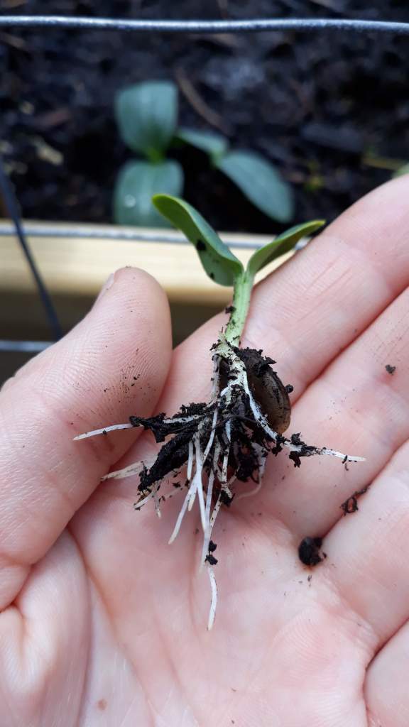 {4/6/21} ••• LOOFAH UPDATE #5: My one lone loofah start is taking off! Can you see the first set of “true leaves” emerging? I’ve got plenty more seeds soaking for another round in case the other seven in the tray don’t pop – though it can take up to two weeks to germinate loofah seeds. These new seeds I’m going to experiment with and clip the outer part of the seed (the seed “coat,” or seed “jacket”) to aid in germination. You can also rough up the seed with a little bit of sandpaper. THE FARMER BEAT TIP: you can do this process (called scarification) with all gourds, nasturtiums, and any larger or harder seed.