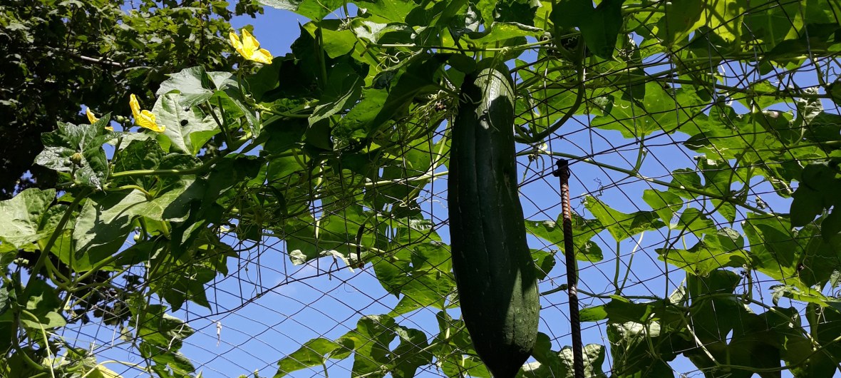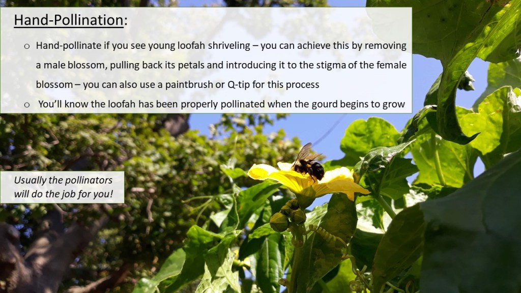 A: That’s up to you entirely! I have gone ahead and plucked the tiny loofahs to promote the plant to send all its energy to the gourds already on the vine. I haven’t, however, plucked any male flower stems. They’re too beautiful and too beneficial for our pollinators. I’d love to hear what works for you!