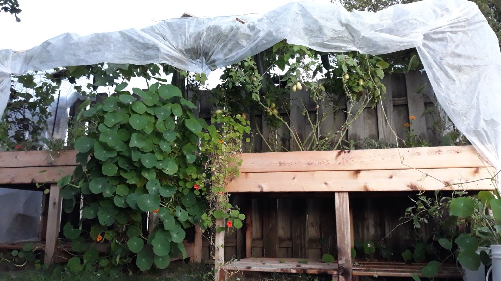 } provided a cozy shelter for the gourds and garden – and by golly it just might work again tonight! Higher temps for the next few mornings at least! Collecting a lot of seeds at this point and cleaning out the garden, bucket by bucket.