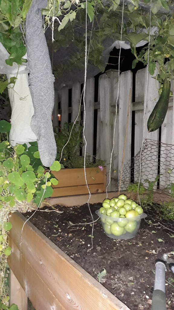 {10/22/21} ••• LOOFAH UPDATE #16: Loofahs in my pillowcase and thigh high socks! Patchy frost in the forecast, but I’ve been growing them all summer and they’re not ready to harvest, so I risked it!! I’ve given them some cozy threads, row cover and blankets. My babies!! We shall see.