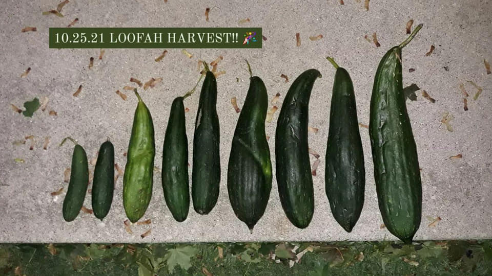 {10/26/21} ••• LOOFAH UPDATE #18: with more frosty mornings approaching, and generally colder days I made the choice to harvest my loofahs! I had already harvested one a few days prior, and I dropped one (that was not even close to drying and it snapped in half like a sad zucchini lol), so that leaves nine healthy loofah gourds. Obviously I would’ve LOVED to see the skins more yellow to brown, but growing subtropical plants that need a long growing season can be tricky in the Midwest. Remember, we had a frost on May 25th this year that cut the growing season by at least 10 days. We got super lucky with about 10 extra days this fall without frost. All in all, I cannot wait to see how they’ve all fared! The skins are hard and beginning to lighten up. I have them in my office with two fans going to promote the best drying. Fingers are still crossed for viable seed and lots of sponges!
