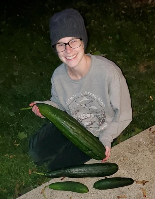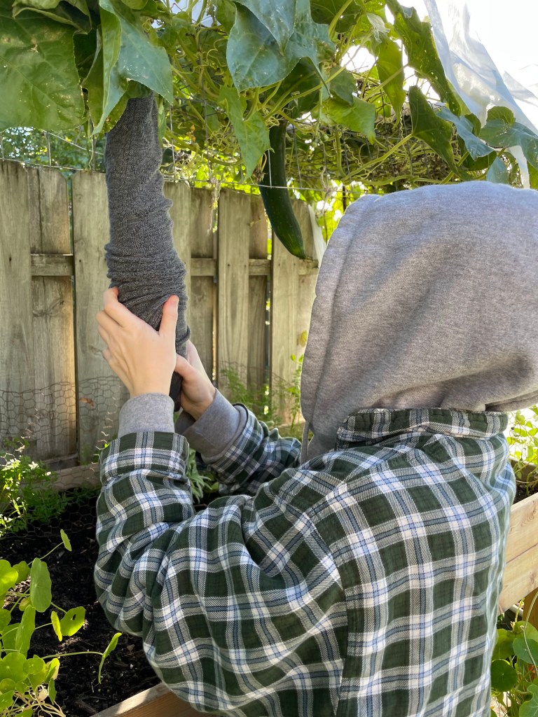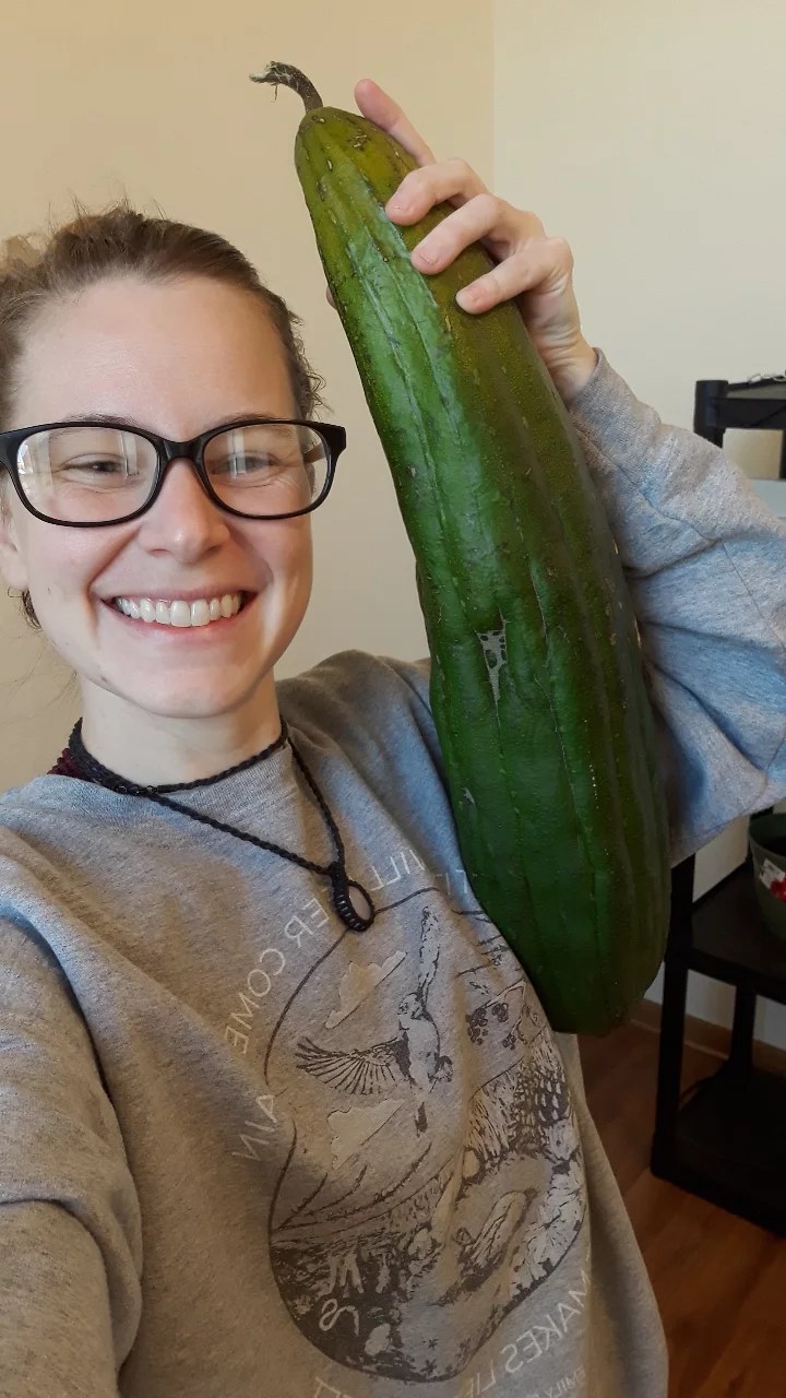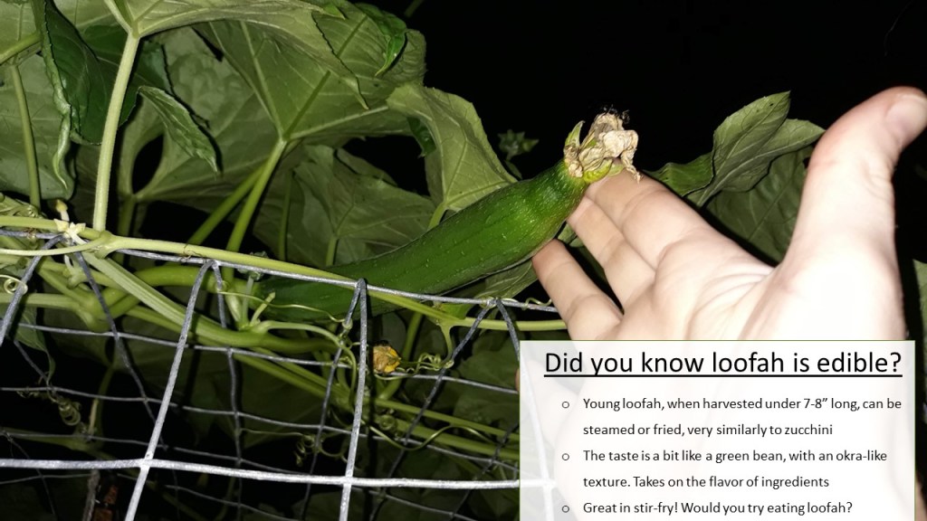 I am very curious if my loofahs will “size up” and get to a mature enough stage to harvest before frost. I am in a few loofah groups on Facebook, where I learned you can harvest loofahs for sponges before the gourds are fully dry and brown and easy to shake the seeds around – that’s the ideal stage to pick! Apparently many gardeners will pick the loofah when it’s a bit more yellow, even yellow-green still. Overall, just by appearance, they almost looked softer? I bet that feels amazing, but also brings up the question: do the fibers break down easier on the softer sponges? Another grower found success wrapping her loofah in a sock when temps dipped below average. I’ll be sure to utilize my *floating row cover wherever I can. Of course, all the coolest cats know the best course of action is to frantically check the weather every night after mid-September, lol! From my research, I’m finding a lot of statements expressing that it takes about eight weeks from the time you see the gourd forming, to a harvestable maturity. It’s going to be close! *Bites nails!* Gardening subtropical cucumber cousins near the IL/WI border (garden zone 5b/5a) is always going to be an anxiously fun experiment!