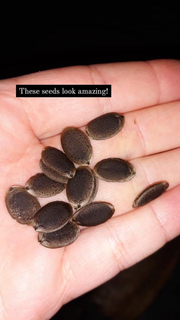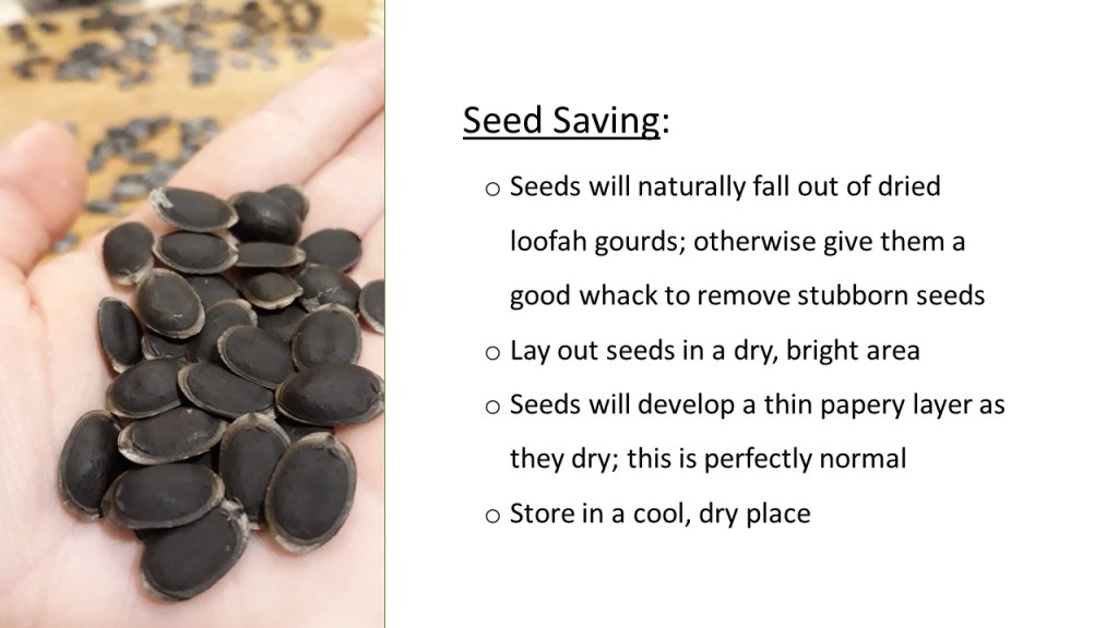 A: What you’re looking for (in most cases, especially if you’re harvesting loofah from the seed I’ve shared) are dark, plump seeds. While I’ve read the lighter color seeds can still germinate if they are plump, I would make sure to always save the most dark, plump seeds for next season germination’s sake.