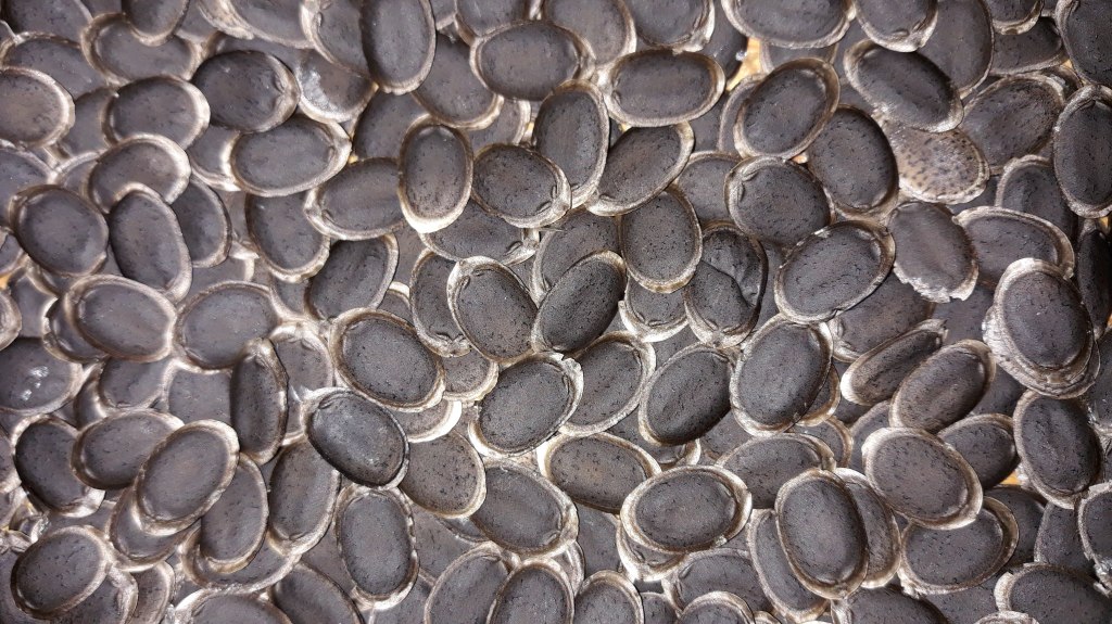 In the end, I came out with nine solid loofah sponges, and about fifteen or more scrap pieces. The largest loofah, which became known as “The Honker,” produced close to 100% of the viable seed from the entire harvest. That loofah gave me 450+ plump, black seed to share this year!