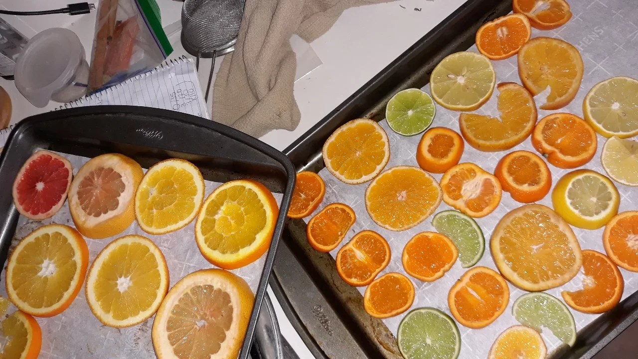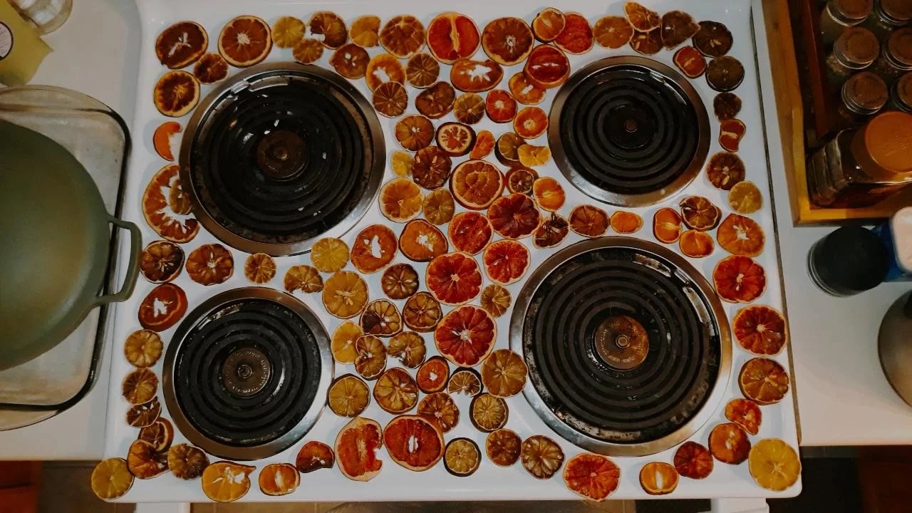 I dehydrated citrus (oranges, tangelos, lemons, limes, grapefruit) and propped them up in front of the string lights, illuminating their beautiful, warm colors. Not to mention, my entire apartment building smelled like an orange hot toddy for weeks! It was all so cozy and inviting during the dark season.