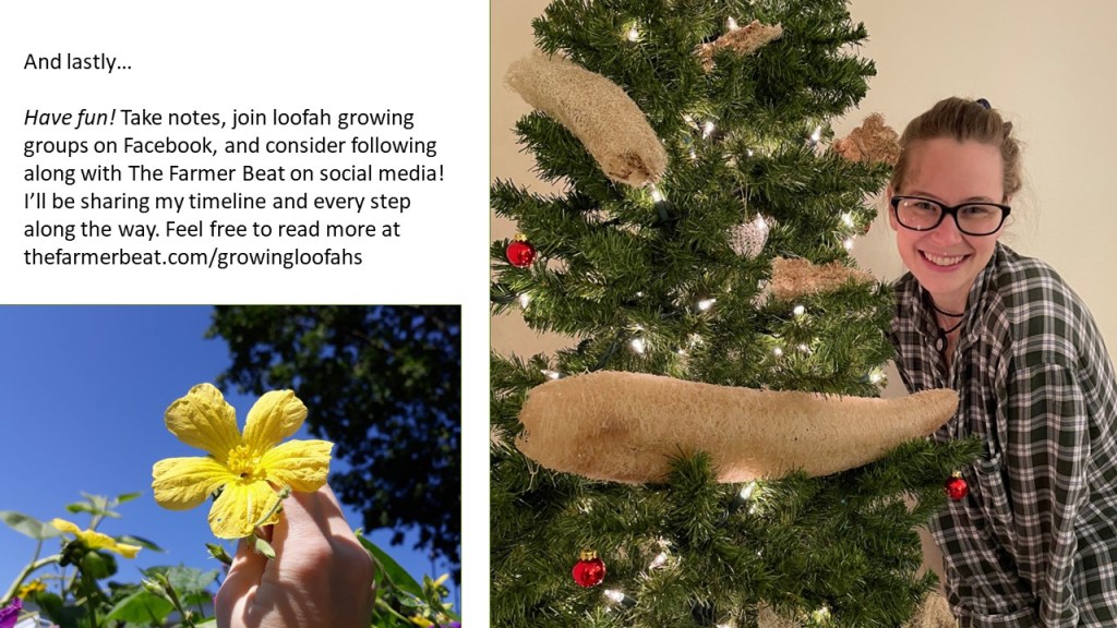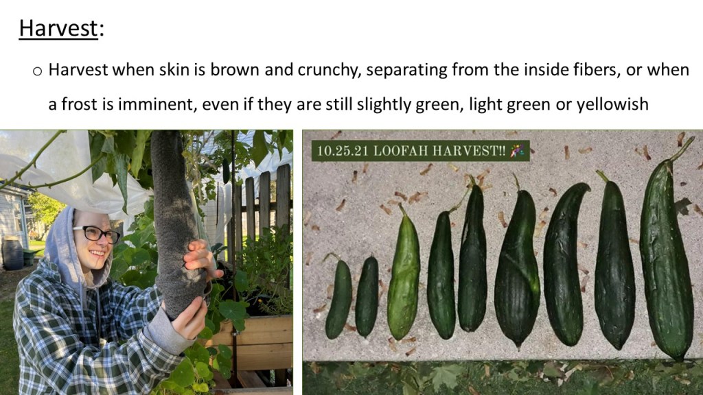 {2/22/24} ••• THE GREAT SEED EVENT PRESENTATION: Earlier this month, I was fortunate enough to give a presentation on all things loofah! This was at the first annual Great Seed Event hosted at McHenry County College. More than 50 guests showed up, eager to learn how to seed, grow, tend to, harvest, process and use loofah, and I couldn’t be more grateful for the experience! I had seed packets, sample loofah rounds and an in-depth growing guide to give out to everyone. It was a lot of fun! Definitely a memory for the books! I am going to share below the slides to this presentation, in hopes that others who continue to find this page will be delighted and inspired by these amazing gourds. Enjoy!